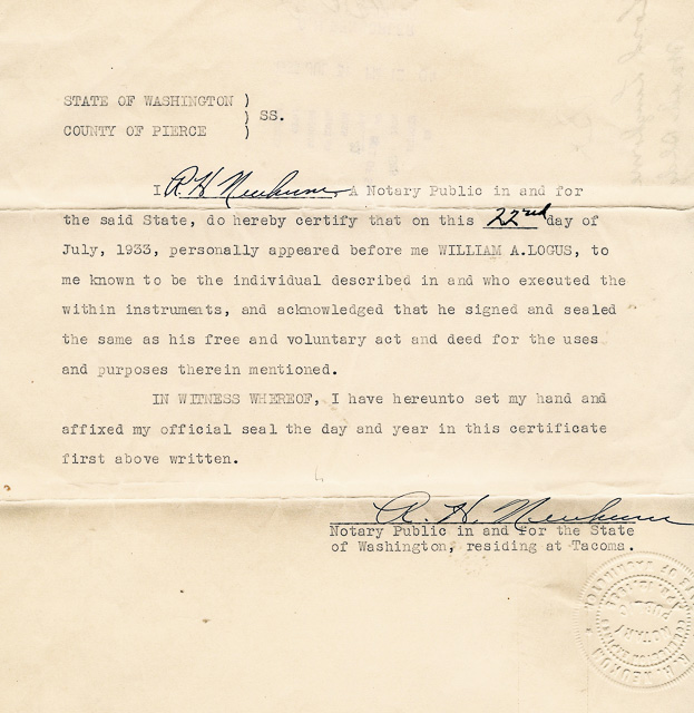 July 22, 1933. Page 3 of sale of Skee-Ball equipment by William Logus of Funland at Point Defiance Park in Tacoma to Clifford Langhorne for $10 during the Great Depression. Logus was a long-time business partner with Carl Phare of Playland.