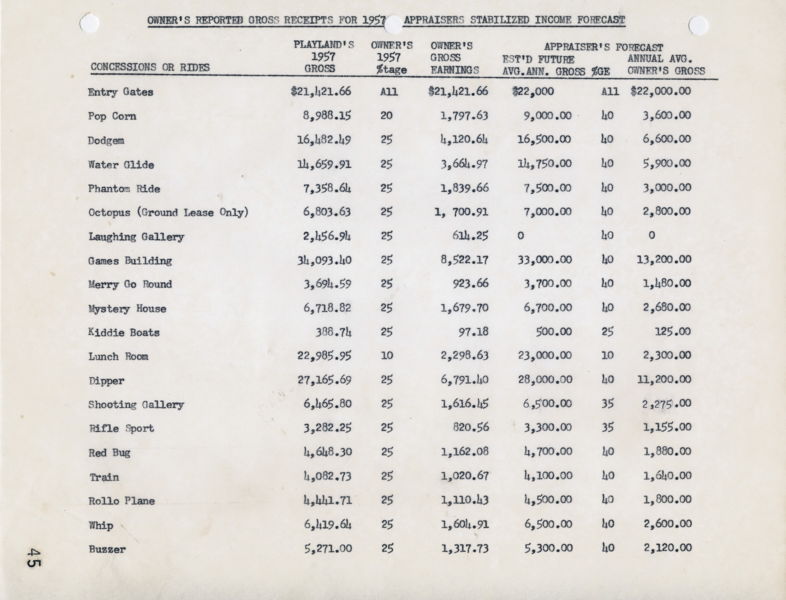 "Owner's Reported Grosss Receipts for 1957" and the appraiser's income forecast.