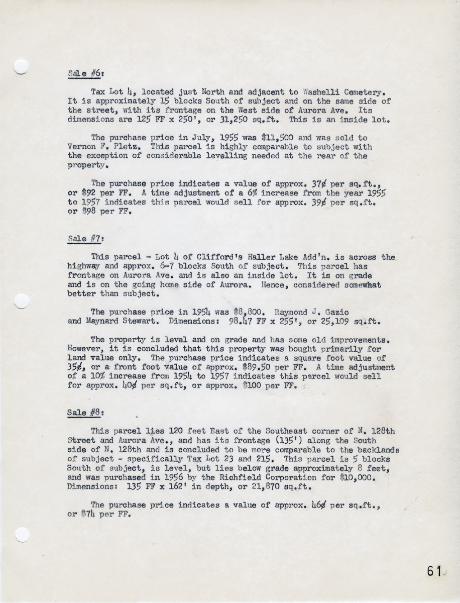 Continuation of "Comparable Land Sales for Aurora Avenue Frontage and Backland" from pages 59 and 60.