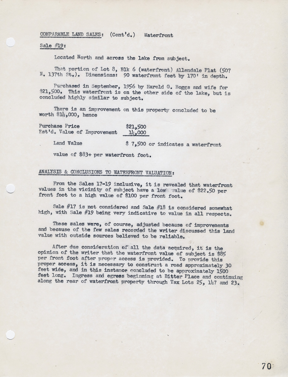 Continuation of "Comparable Sales of Waterfront Land" from page 68 and 69, and "Analysis and Conclusions to Waterfront Valuation."