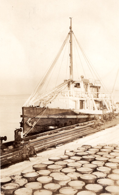 Dec 18, 1924. Standard Oil company ship "Contra Costa" , Captain Gustav E. Bratt at Pt. Wells. The Contra Costa was built to his specifications. Oil barrels standing on end in the snow and the ship covered in ice.