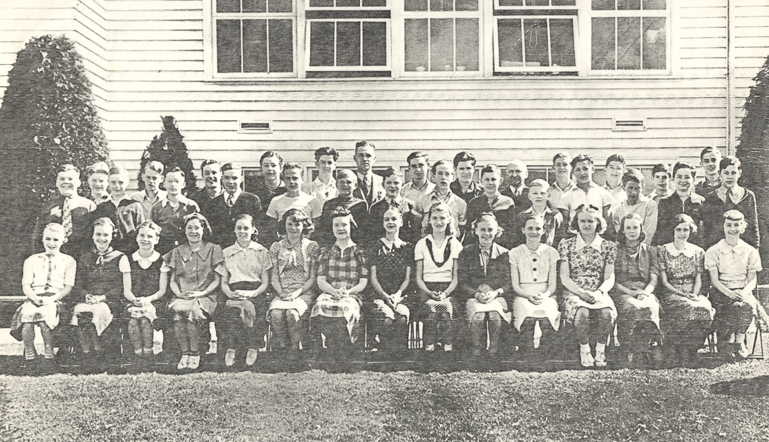 June 1938. Lake Forest Park School Eighth Grade. Mr. V.A. Berto, teacher. Student names are in "Growing Up With Lake Forest Park" by Barbara Bender, page 357. Photo donated by Dorothy (Gwinn) Rogers.