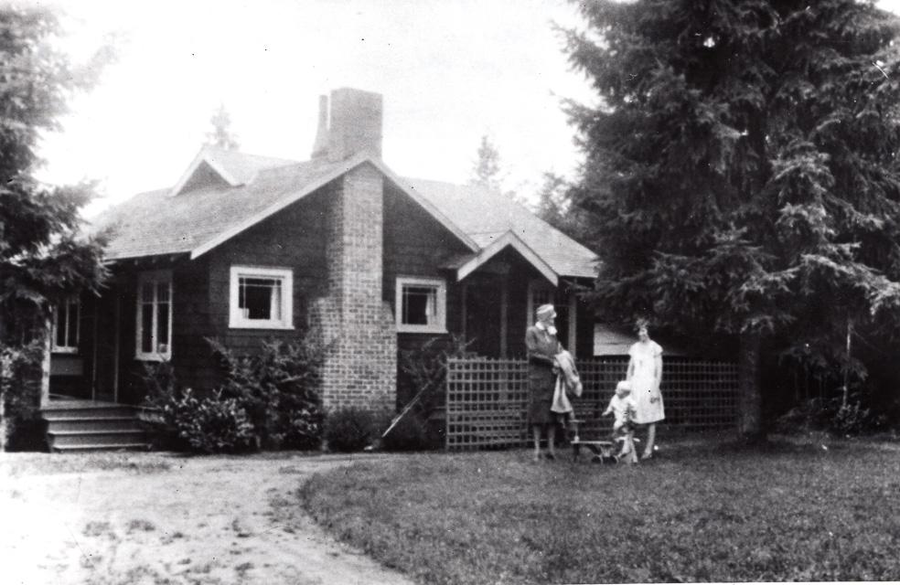 Frank and Huldah Weyeneth's home, built in 1914 and photo taken 1928. L-R: unknown, baby Rich and mother Huldah Weyeneth. This was built by Edward Gomoll in 1914, possibly sold to Margaret E. Atkinson, and sold to Frank Weyeneth in 1927. Lake Forest Park addition. See "Growing Up With Lake Forest Park" page 38-39, 84, 186. Photo donated by Huldah Weyeneth.