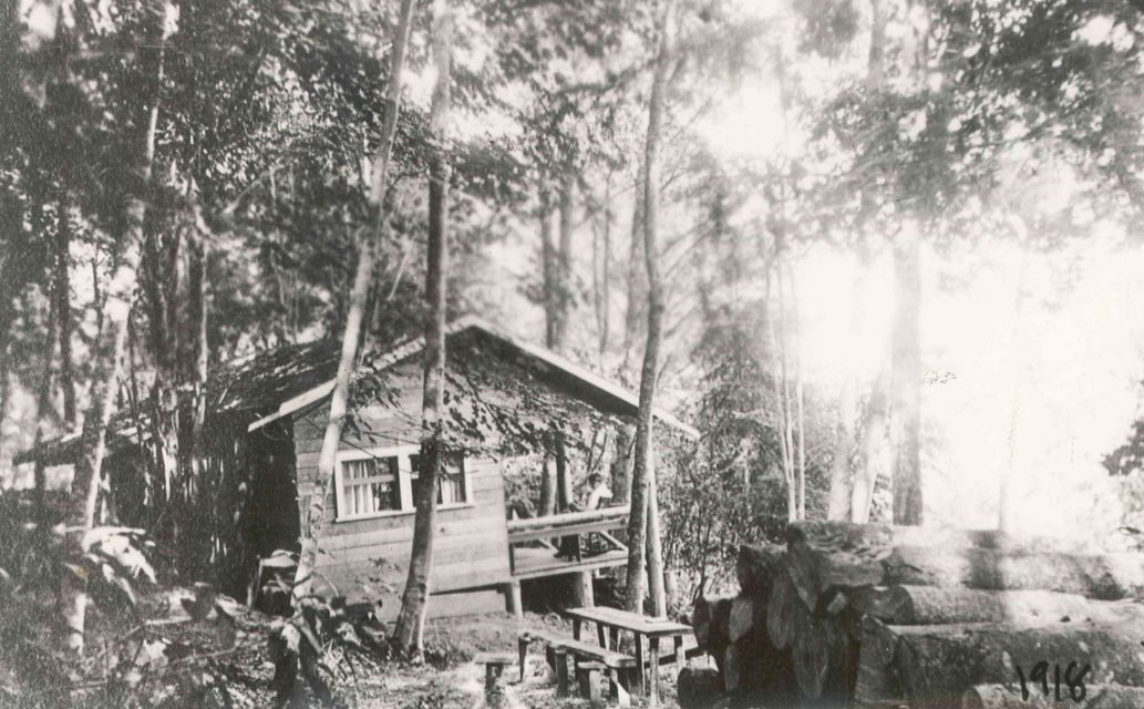 1913. Frank G. and Emily C. Peterson's acreage above Lake Washington, a forest cabin they called The Camp. (Briercrest.) Emily is reading in a rocking chair on the porch. See "Growing Up With Lake Forest Park" pp 141-2. Photo provided by Mike Brown, great-grandson of Frank Peterson.Photo provided by Mike Brown, great-grandson of Frank Peterson.
