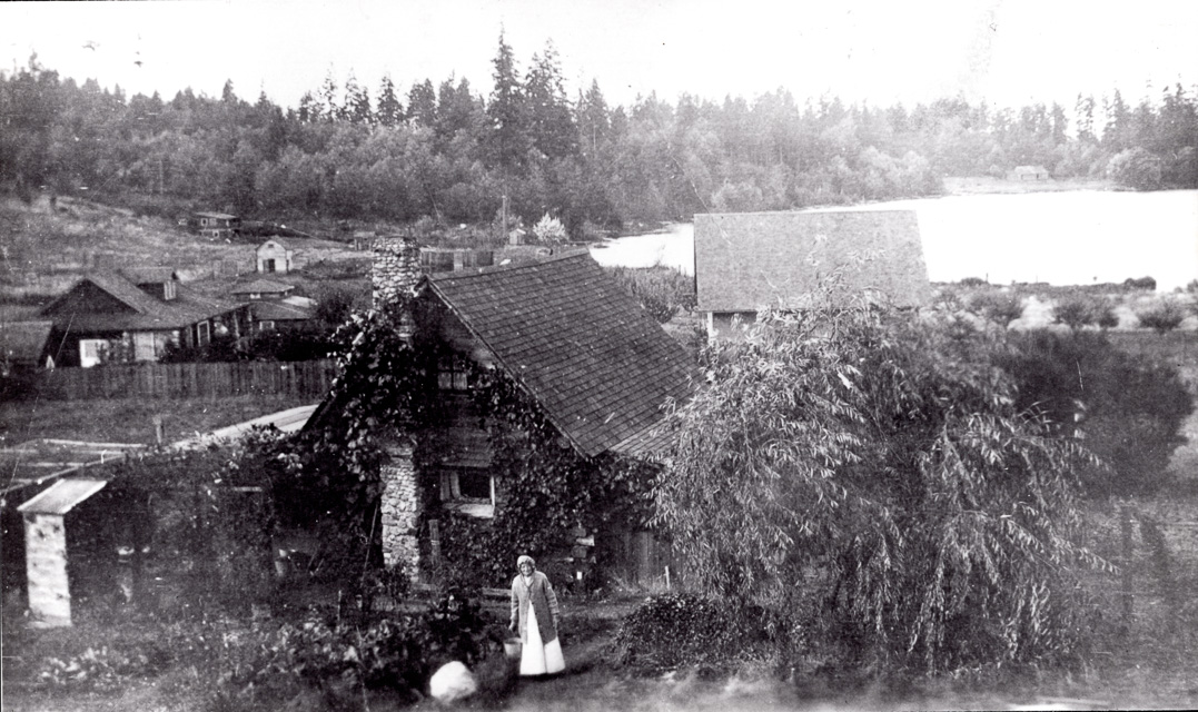 1916. Mrs. Emme in front of her log house on south end of Echo Lake.