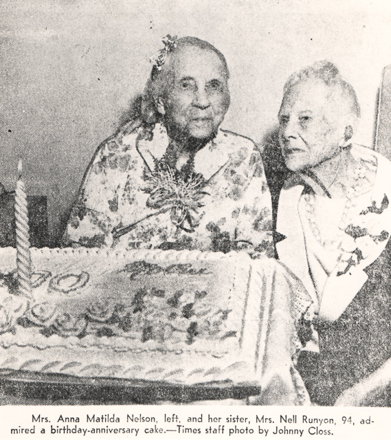 November 28th, 1966. Seattle Times article about Mrs. Anna Matilda Nelson celebrating her 100th birthday with her sister, Mrs. Nell Runyan, age 94, in the Gardner Nursing Home in Lake City. Grandmother of Don and Lola Nelson, Lake Forest Park graduates. Original article donated by Don Nelson.