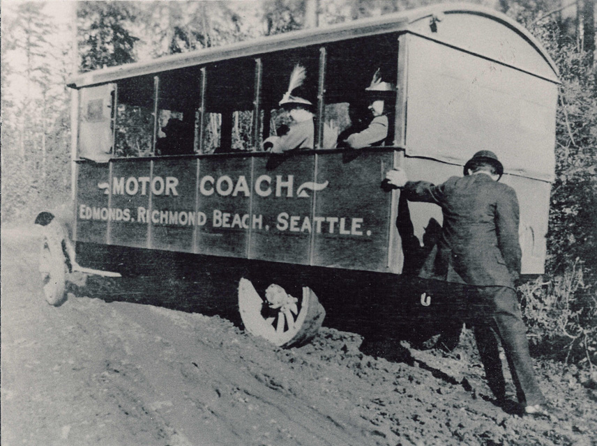 The Yost Brothers Motor Coach company was based in Edmonds. One of the Yost brothers is pushing on the coach.