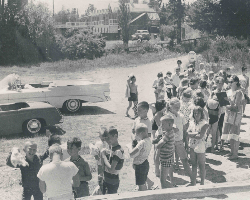 Pupils walking from the school bus on Aurora Avenue to the beach for swimming lessons. In the background is a World's Fair building that was moved to this site along Aurora.