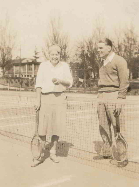 1931. Ralph Wuestenhoefer (born 1911) at the Ronald School tennis courts. The woman is possibly his wife, Mildred (Wickstrom) Wuestenhoefer. Photo donated by Mildred Wuestenhoefer.