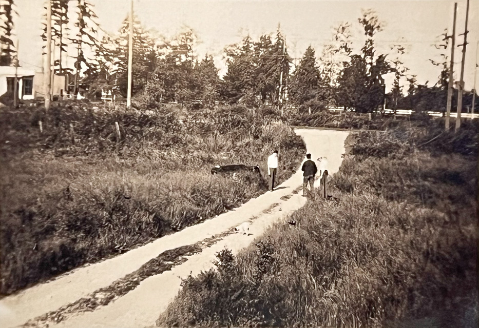 1925. Ronald Store at left on 175th Street, and the Interurban tracks are at the end of this unpaved road. Standing are Floyd Reynolds, Delwin "Del" M. Reynolds, and Harold W. Sill. Donated by Floyd Reynolds.