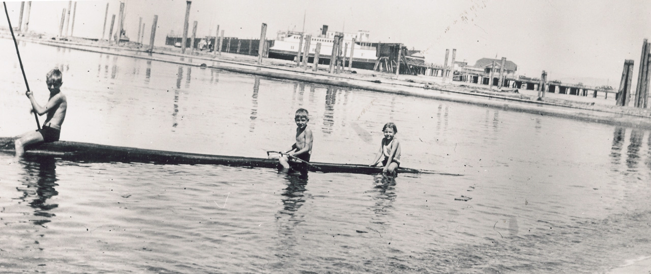 Children playing in saltwater at the Edmonds waterfront and dock. Paul H., John W. and Mary C. Tuski.