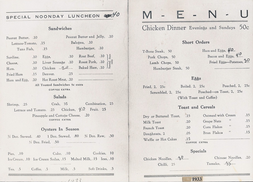 Menu from Bessie B. Lunch, 1933
