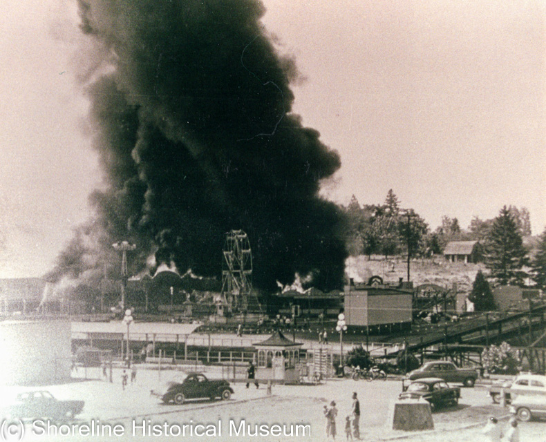 Aug. 20, 1953. Contrary to popular belief, neither Playland nor the Dipper burned down that fateful day in August 1953. The clouds of black smoke rose from the Mystery House, Old Mill, Restaurant and park office, all of which contributed tinder-box contents and tarred roofs to provide fuel for the blaze. The west corner of the Dipper caught some flames and had to be replaced. Photo courtesy of Nina Fraley.