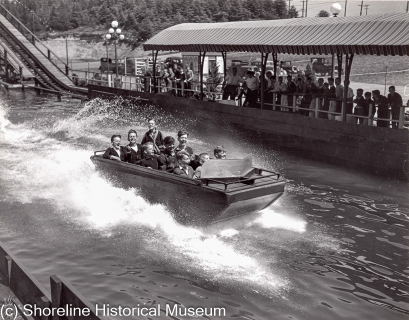 1940s. On the immediate right of the Aurora Entrance was one of Playland's crown jewels. About six people got into a boat which went up a steep incline to a height of 61 feet. At the top, the boat made a hairpin turn toward a downward slope and was released from the chain. Then, coasting in free-fall, the boat gained speed until it hit the big pool of water at the bottom. Water sprayed as the boat coasted to a gentle stop. Photo courtesy of Seattle Post Intelligencer and donated by Kay and Hal Schlegel.