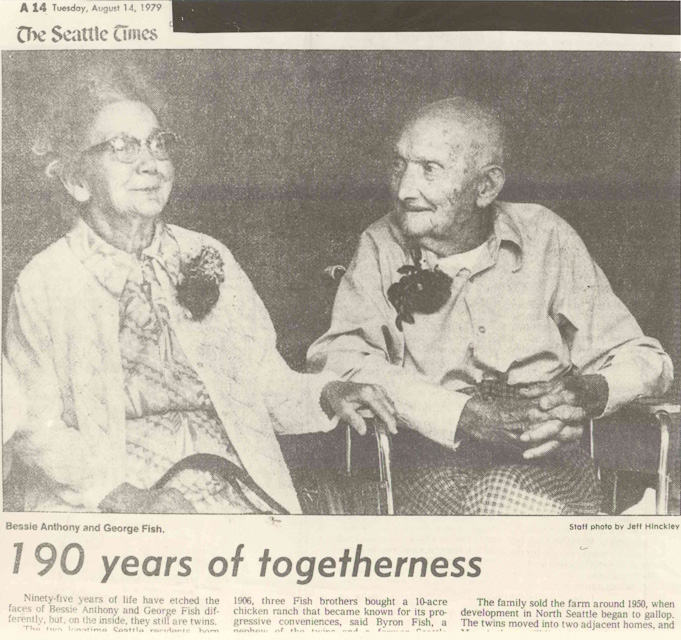 Aug 14, 1979. Seattle Times article about 95-year old twins Bessie Anthony and George Fish.