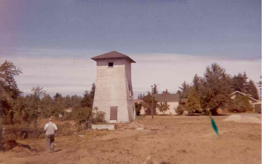 This pump house tower at 165th Street and Aurora Avenue supplied a large area with water from the pump. A well digger guessed its depth at 185 feet. Pump house was also used at one time as an office building for a trucking firm. Since 1976, the site of U-Haul Dealer.