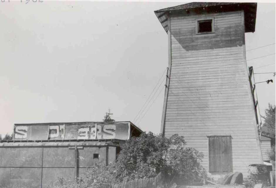 This pump house tower at 165th Street and Aurora Avenue supplied a large area with water from the pump. A well digger guessed its depth at 185 feet. Pump house was also used at one time as an office building for a trucking firm. Since 1976, the site of U-Haul Dealer.