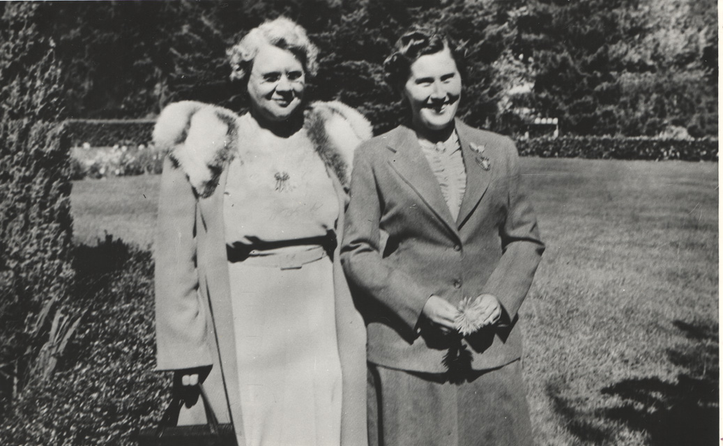 Early 1940s. Mrs. Frank D. Ford (Gladys) and Loa-Jean (Myhre) Wilcox at the Ford's home across the street from the Lake Forest Park School.