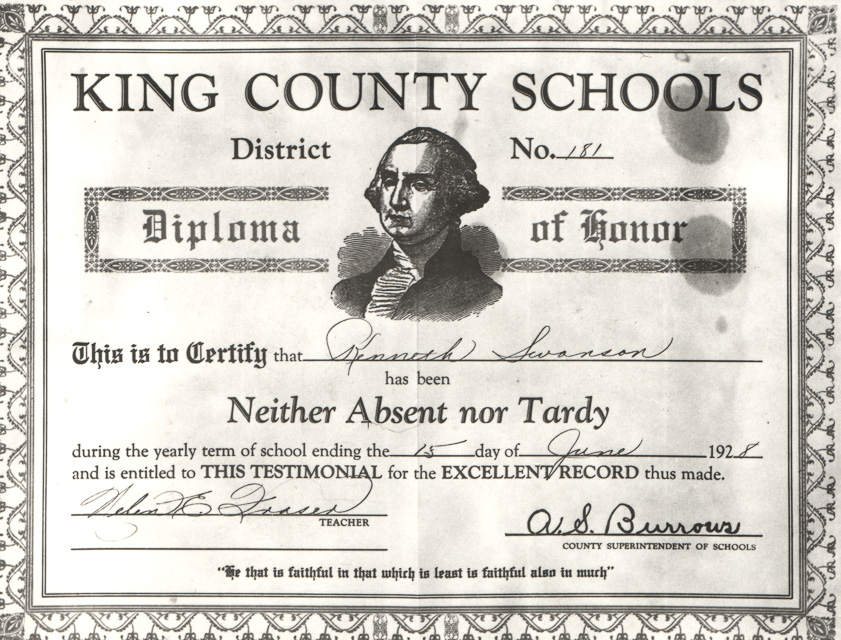 June 15, 1928. Diploma of Honor for Ken Swanson's perfect attendance at Lake Forest Park School.