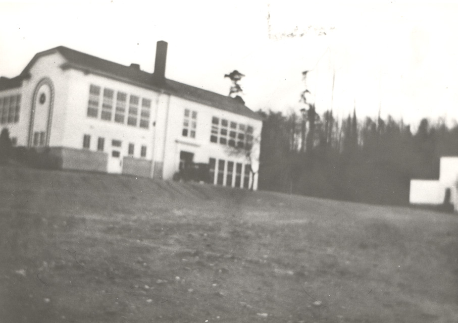 About 1938-39. Lake Forest Park School building at Ballinger Way and 37th Avenue NE, showing mainly the southeast side. Gym at far right. Photo donated by Garth Conger.