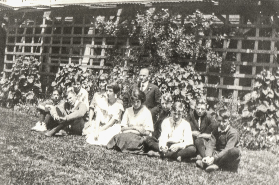 1923. Lake Forest Park Eighth Grade. L-R: Edward Osborn, Horatio "Tink" Smith, Robert Rossman, Frances Blanchard, Mildred Brooks, Katherine Kuentzel, William Chace, Floyd Stanley, Arnold Conrad, Ray Metke, Mr. Norval Mallahan. Photo donated by Katherine (Kuentzel) Norris.