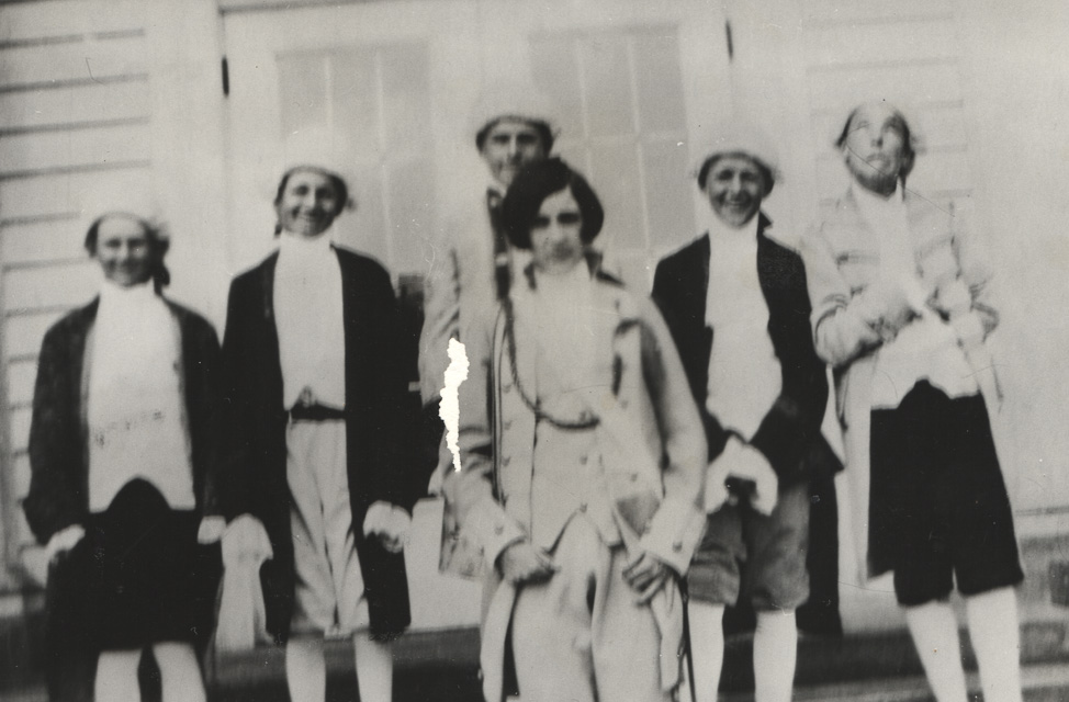 1926. Lake Forest Park School students providing the program on Graduation Day. Colonial costumed class members: Billie Balles, Gene Dillon, John Capell, Bill Stending, Lowry Colling. See "Growing Up With Lake Forest Park" page 462. Front: Mary Brooks. Photo donated by Beryl (Watson) Axtell.